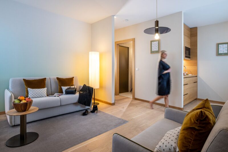 Die 23 Apartments sind zwischen 25 und 60 qm groß und tragen bayerische Vornamen wie Sissi, Leni und Franz. Bei der Gestaltung der Räume wurden vorrangig recyclebare, natürliche und ressourcenschonende Materialien wie Holz, Sand, Stein und Glas verarbeitet. Die Wohneinheiten verfügen über eine Essecke, ein Sofa, eine voll ausgestattete Küche und bieten technischen Komfort durch Smart-TV, WLAN, USB-Steckdosen und USB-Ethernet-Anschluss. Die Badezimmer sind mit geräumigen Duschen versehen. Extralange Betten sorgen für einen erholsamen Schlaf.